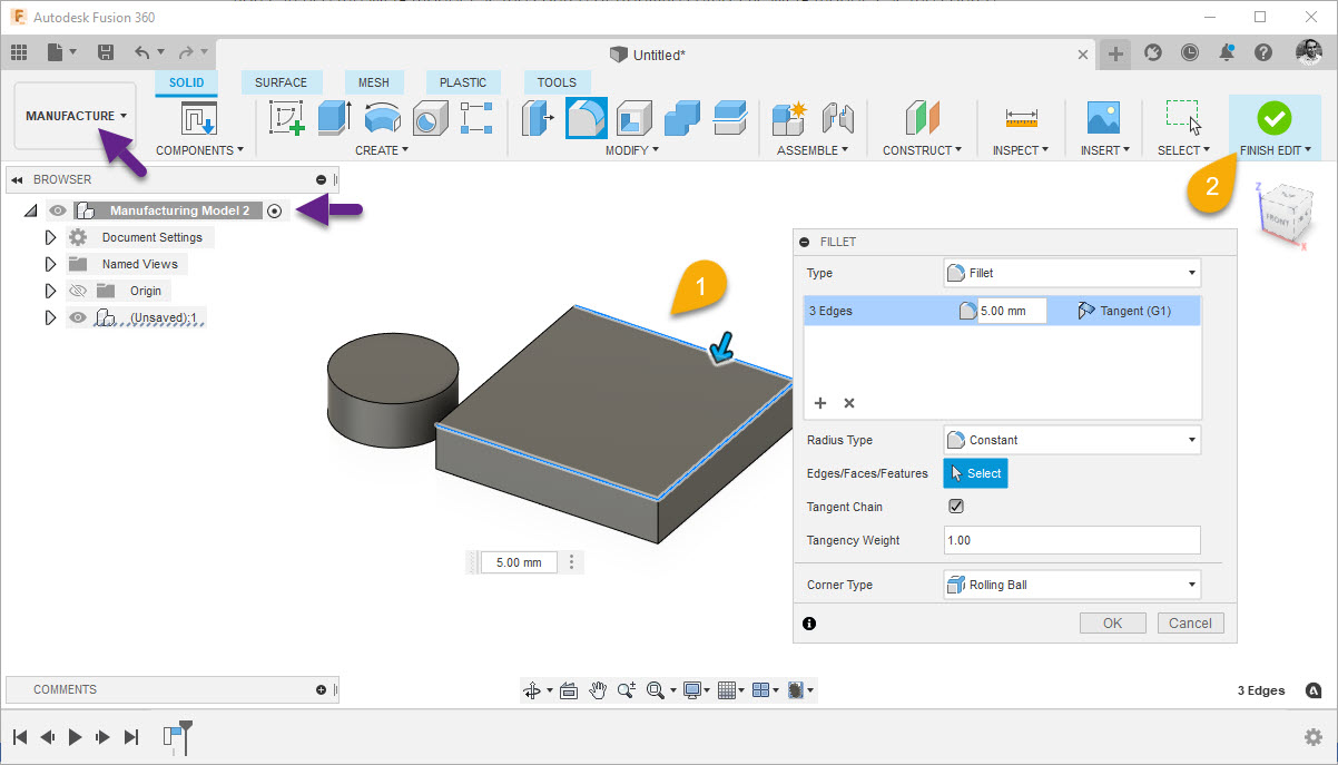 When you first enter the MANUFACTURE workspace of Fusion 360, you automatically get a copy of your design this is generally named CAM Root assuming you did not save / name your design. Before creating additive setup, it is always a good idea to create a “Manufacturing model” for each Additive setup. Each “MFG model” is also a copy of the “CAM root”. this way you can use the MFG model 1 as the source of Additive setup 1 vs MFG model 2 as the source of Additive Setup 2 etc.