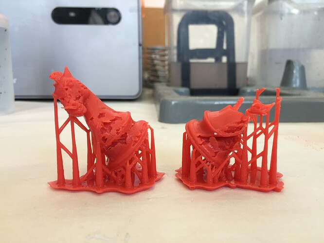 As you can see from the pictures. The right one was the first try. The bottom part looks fine but the side connected with the support has a lot of holes, and the print breaked in the middle. The seconded try also has lots of holes on it.