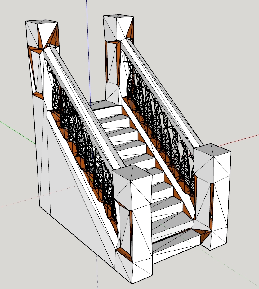 I’ve designed this flight of cast cement stairs and scaled it as needed in SketchUp 2017. It passes all the sold tests with Solid Inspector 3, export to OBJ and open in Preform. No errors generated anywhere.