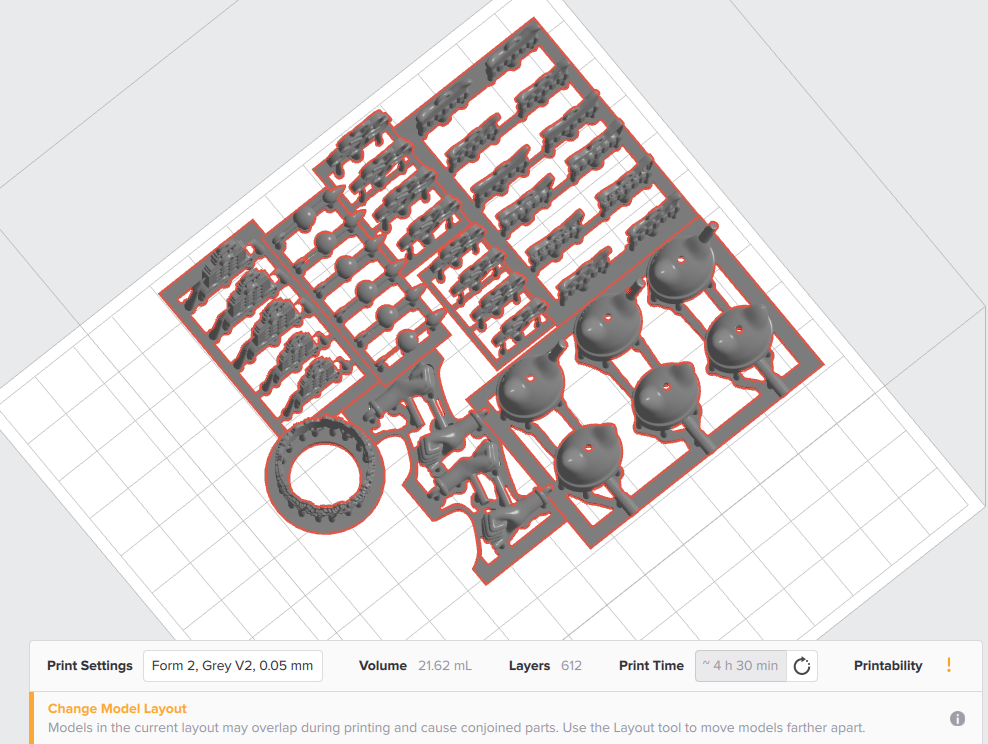 I’m using a Form 1 with Clear resin V2 and Black resin V2, and I’m using the most recent version of PreForm on my Mac. I’ve saved my design here in case anyone is interested: https://cl.ly/372f3P0G372Z