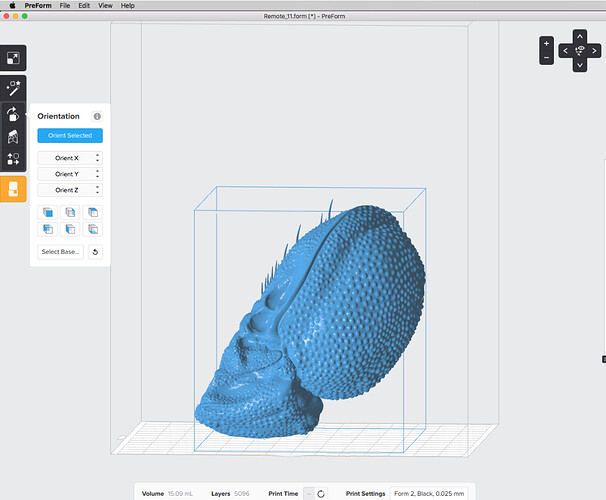 If you split that part off then you have a surface on the inside of the two parts where you can put supports and it’ll be easy to clean up, and then you can have the bumpy parts oriented up so that they get the best detail.