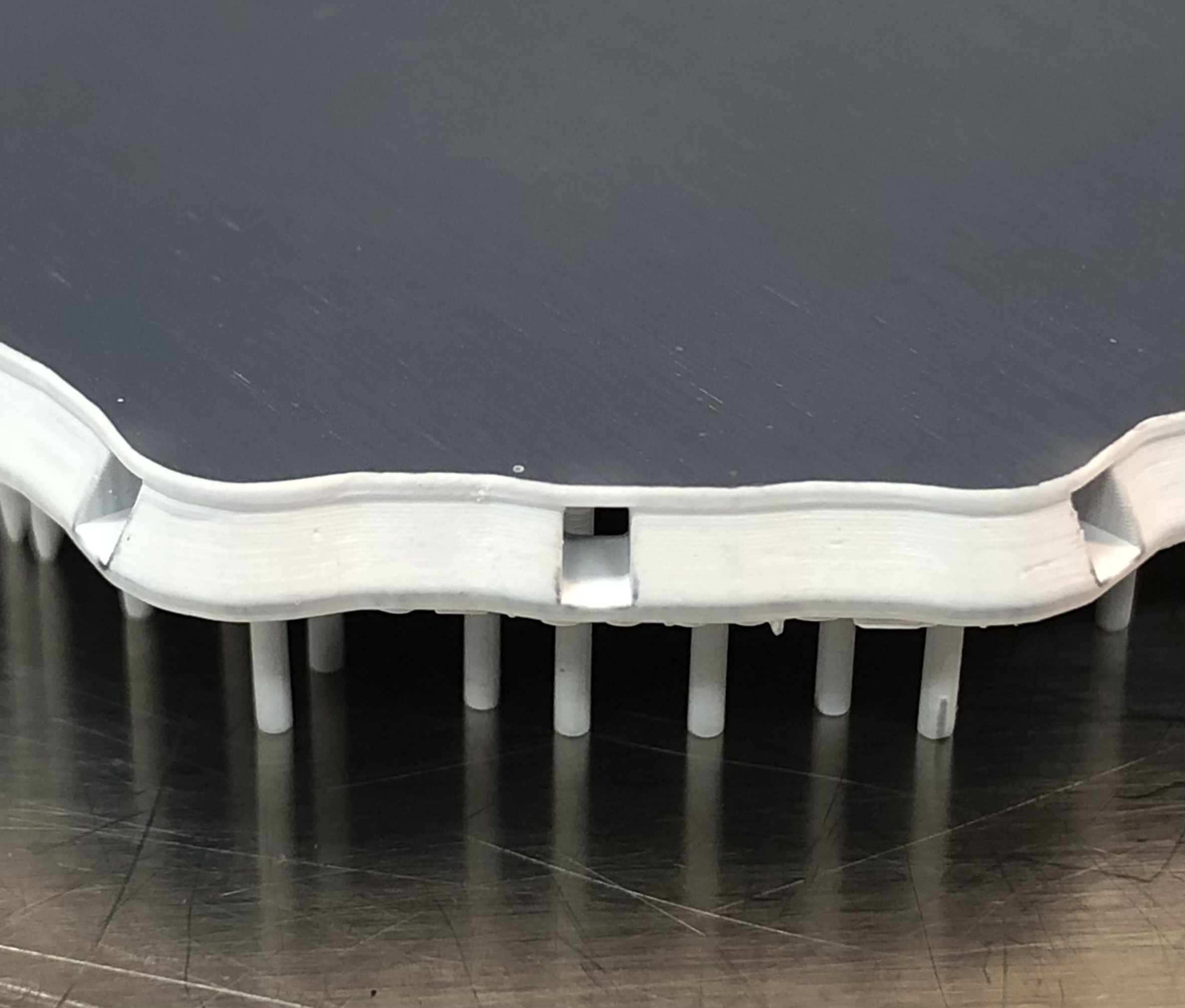 I also wanted to post a few photos that I think get at the problem we’re having with tinting this resin. Here I’m showing the raft and supports from a recent print with the most amount of ink in the resin. As you can see when we zoom into a snapped support only the outer few 10s of microns takes on the white powdery color (scale is 1mm ticks on a ruler). The core of the support is dark. Looking at the topside of the raft (the side not attached to the build platform) it also has a darker color compared to the sides of the supports. Lastly the underside of the raft, the side attached to the build platform, shows the true dark color, i.e. what we see when sanding down other surfaces. Therefore, the white powdery surface only seems to adhere to faces that are not parallel to the build platform, and is only a few 10s of microns thick.